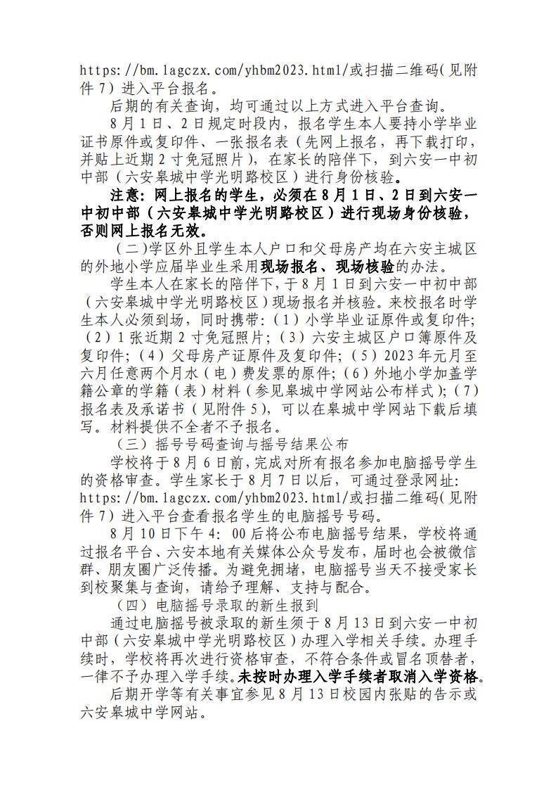 附件2:六安一中初中部(六安皋城中学光明路校区)报名、核验和录取办法