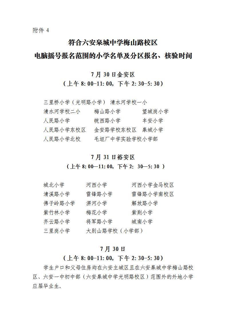学区外的六安主城区小学(见附件4)学籍应届毕业生;学区外且学生本人户口和父母房产均在六安主城区的外地小学应届毕业生。