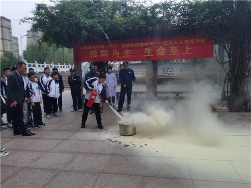 活动的第二阶段是消防安全室外灭火演练。报告会后在校园西广场上,方主任为我们讲解了不同类型灭火器的使用和注意事项,并进行了现场灭火演示。同学们跃跃欲试,积极参与灭火演练活动。学校全体保安、后勤、食堂工作人员也参与此次演练活动。