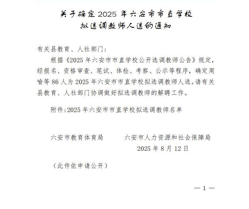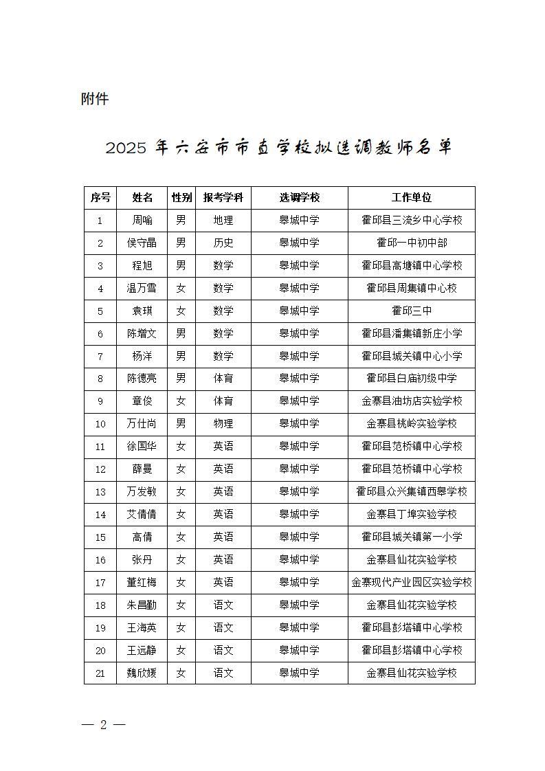 关于确定2025年六安市市直学校拟选调教师人选的通知