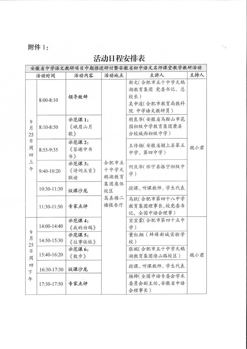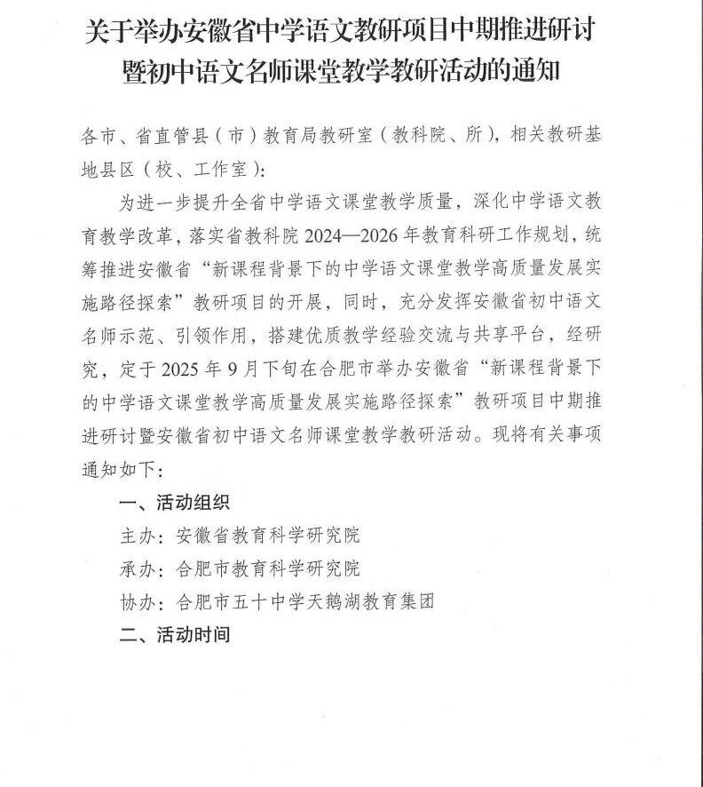 关于举办安徽省中学语文教研项目中期推进研讨暨初中语文名师课堂教学教研活动的通知