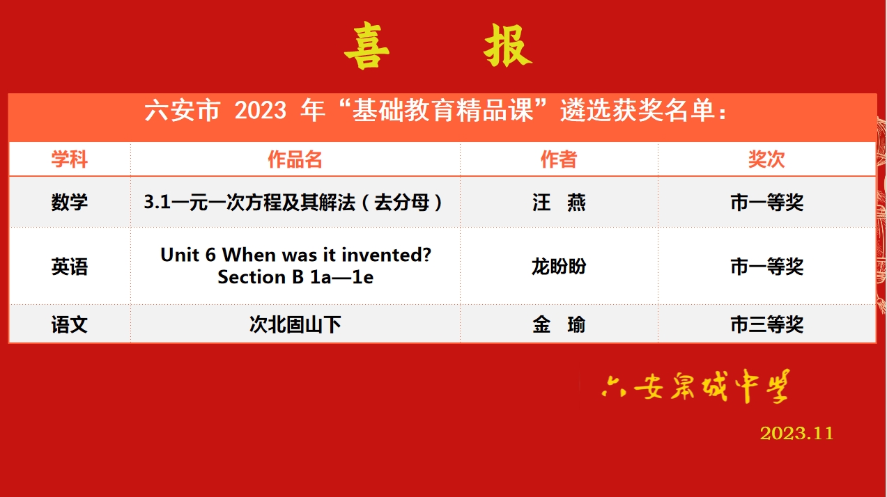 热烈祝贺六安皋城中学教师王莉在全省第十届法制微课比赛荣获初中组一等奖,将代表安徽省参加国赛